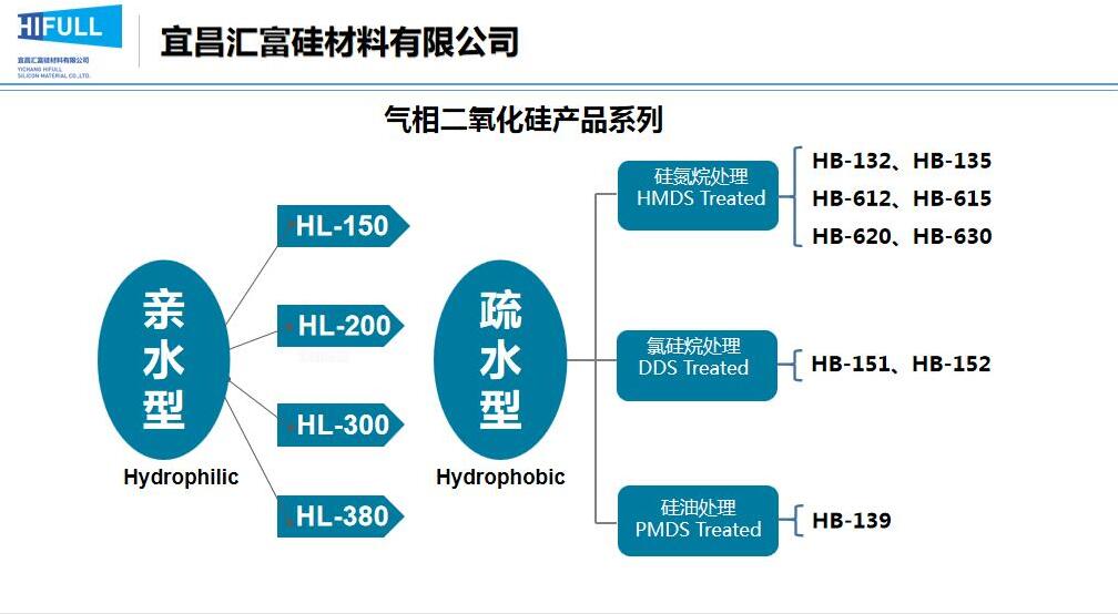 宜昌汇富硅材料有限公司是一家专业从事气相二氧化硅(俗称气相法白炭黑)研发、生产和销售的国家级高新技术企业。公司在气相二氧化硅行业具有二十年技术沉淀,主导制定了ISO18473-3:2018《硅橡胶用气相二氧化硅》国际标准和GB/T20020《气相二氧化硅》国家标准。公司拥有HL-150、HL-200、HL-300、HL-380系列亲水型气相二氧化硅和HB-612、HB-151、HB-139D等九种牌号的疏水型气相二氧化硅两大系列产品,在产能与深加工处理技术等方面处于优势地位。