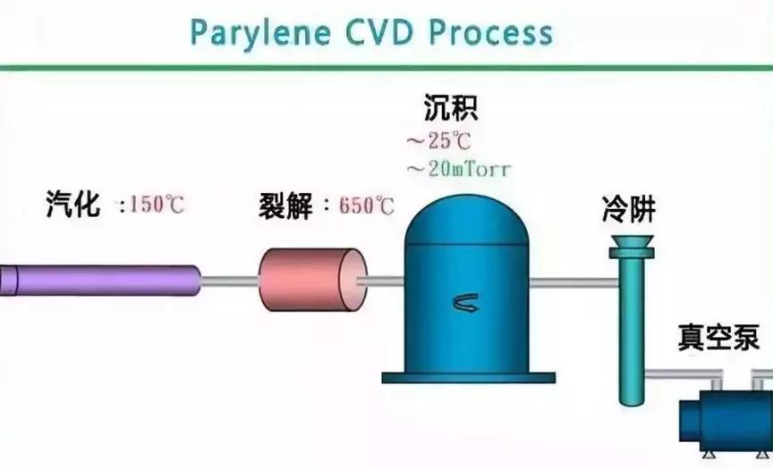 Parylene采用了一种独特的化学气相沉积工艺(CVD)。CVD工艺最早应用于半导体工业的外延生长,整个过程是气态反应,又在真空条件下进行,因而可以获得非常均匀的涂层,达到其它方法难以实现的同形性。