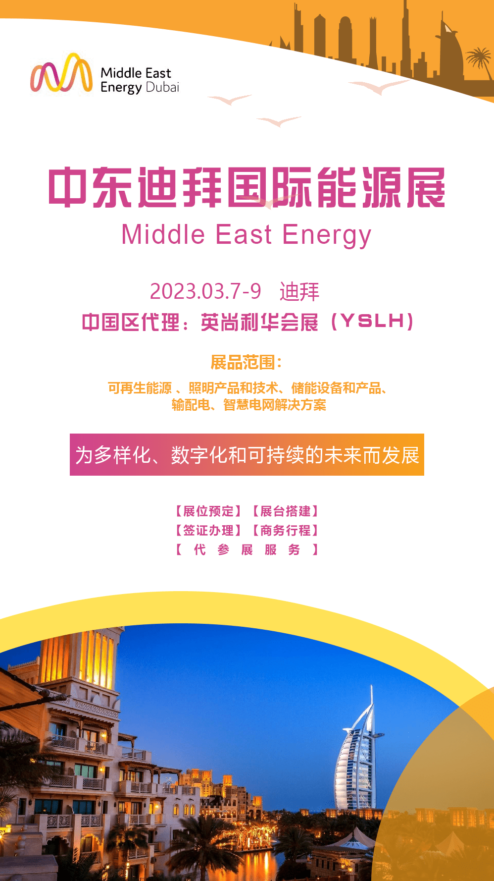 中东迪拜能源展MIDDLE EAST ENERGY(简称MEE)是中东海湾地区最大的专业能源展会,每年都会吸引大量专业领域的生产商、贸易商及买家前来参展,促成超过数百亿美元的贸易。展会致力于电力、可再生能源主题,已成为中东最大最优秀的专业贸易平台。上一届迪拜能源展所展出的高科技产品及技术和最新研究成果代表了世界电力能源行业的发展方向,来自世界各地的1100 余家企业齐聚于此,展会三天超过20000 名专业观众参观。