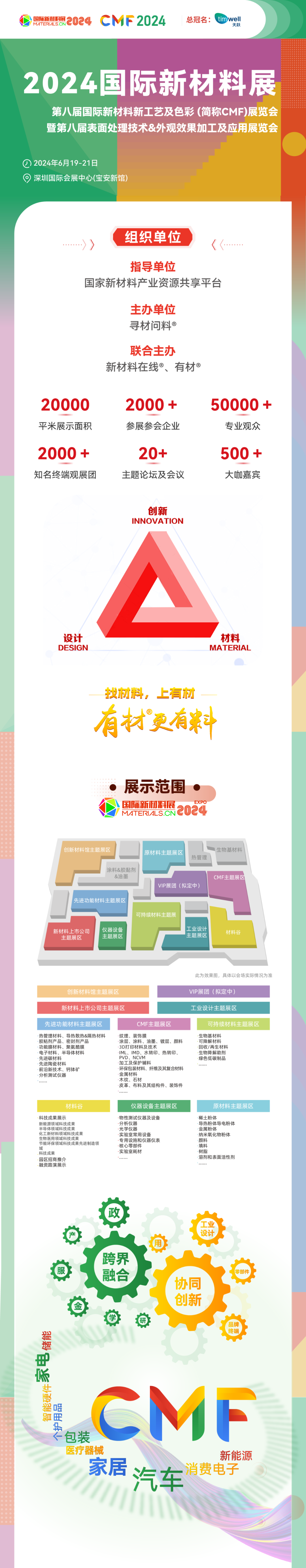 2024年6月19-21日,2024国际新材料展(第八届国际新材料新工艺及色彩(简称CMF)展览会暨第八届表面处理技术&外观效果加工及应用展览)将在深圳国际会展中心(宝安新馆)隆重启幕。本届展会将分为CMF(COLOR MATERIAL FINISH)、先进功能材料、可持续材料、材料谷、仪器设备、原材料、上市公司、工业设计、创新材料馆、VIP展团等主题展区,旨在为全球新材料产业搭建集展览展示、行业交流和采购洽谈于一体的综合服务平台。