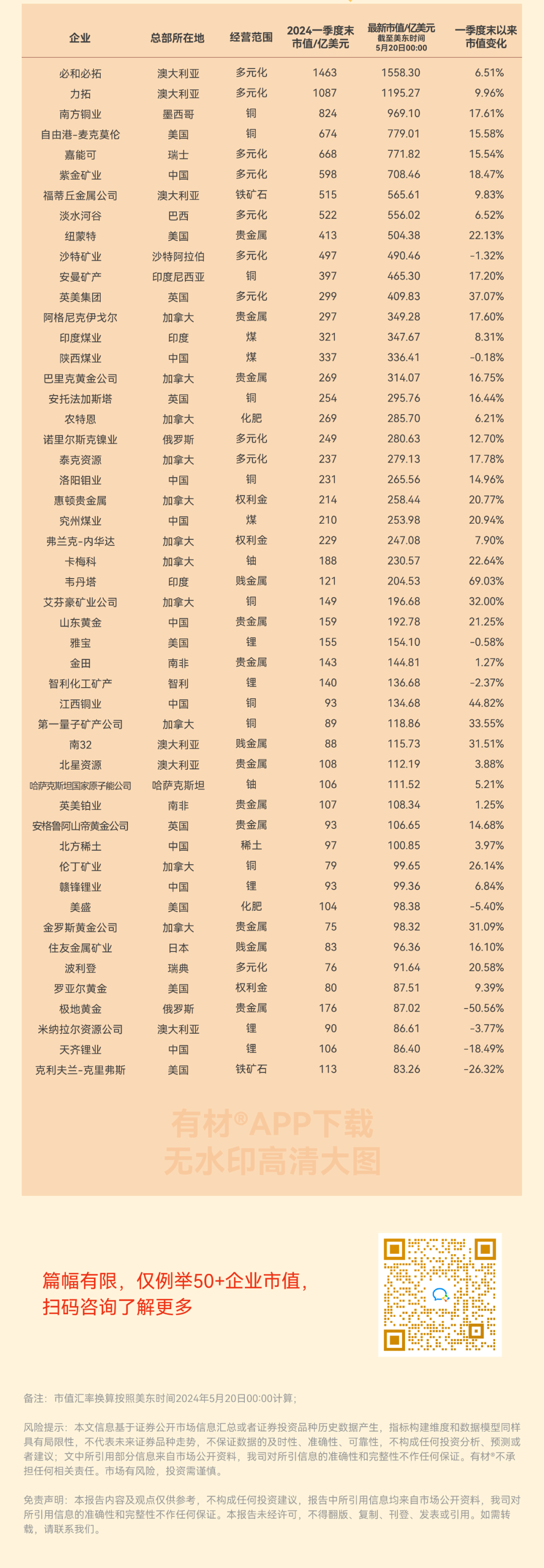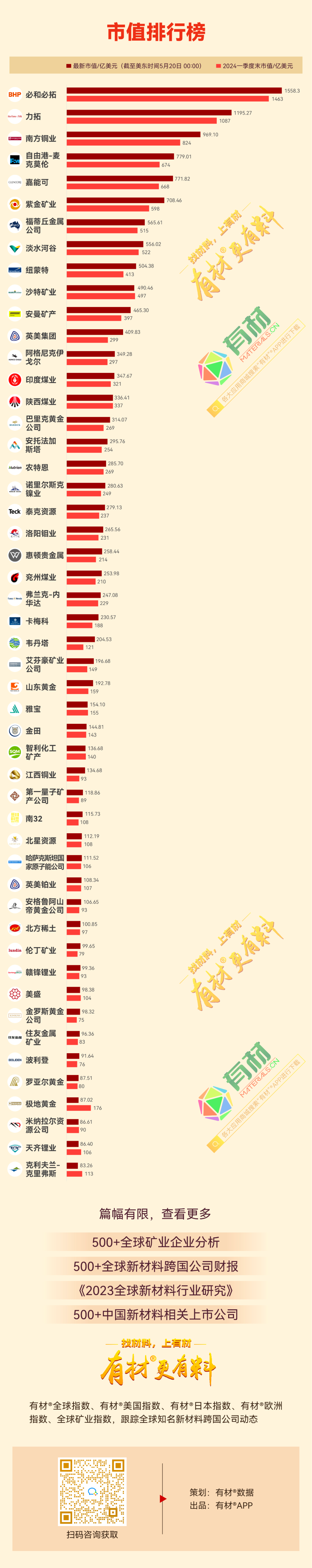 近日,国际矿业网站MINING.COM以总市值为依据,发布了2024年第一季度的“全球最具价值矿企50强榜单”。近两个月,有色金属大幅涨价,截至5月20日,全球最具价值矿企市值发生较大变化,平均涨幅12.46%,最高涨幅达69.03%。