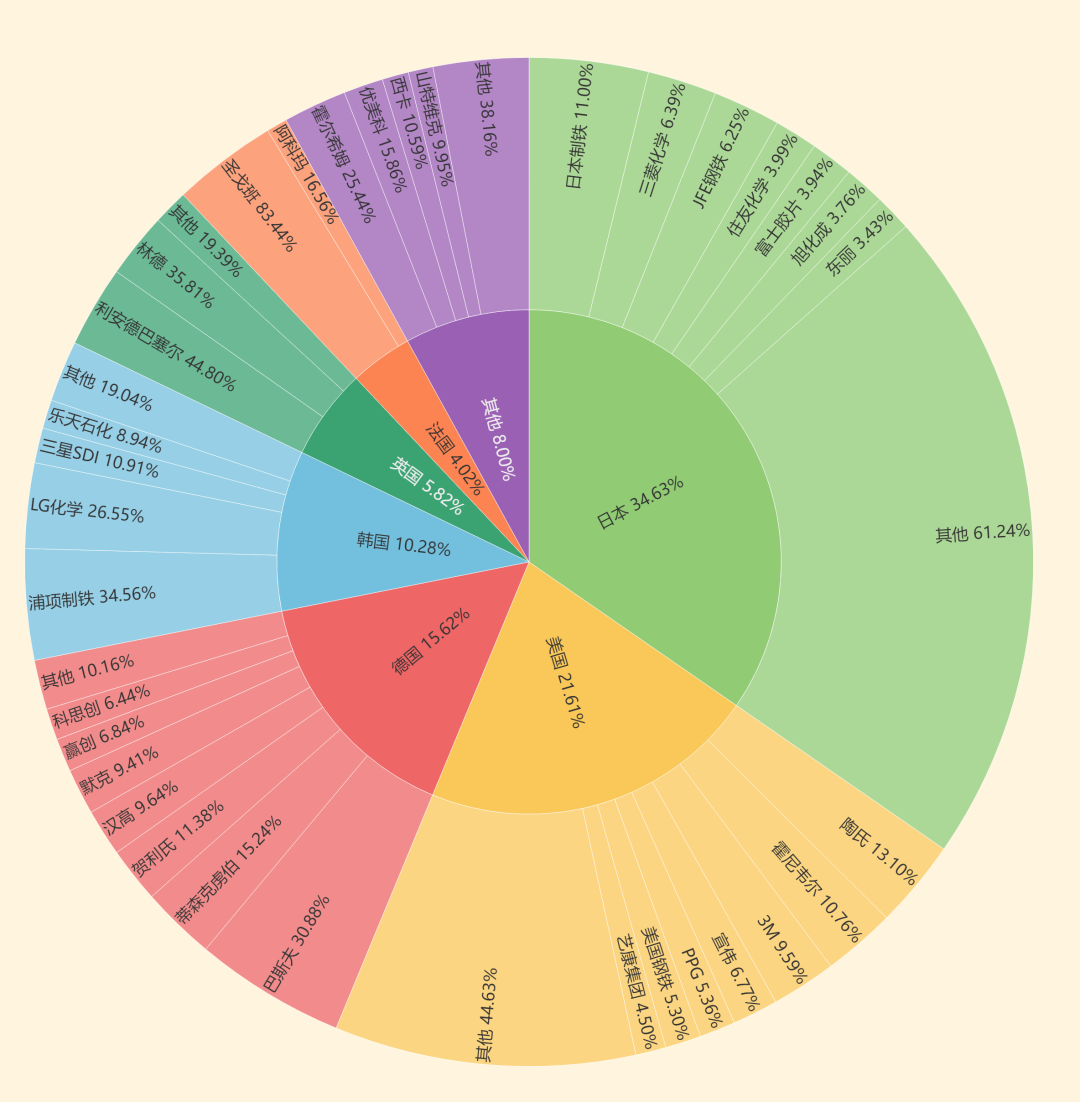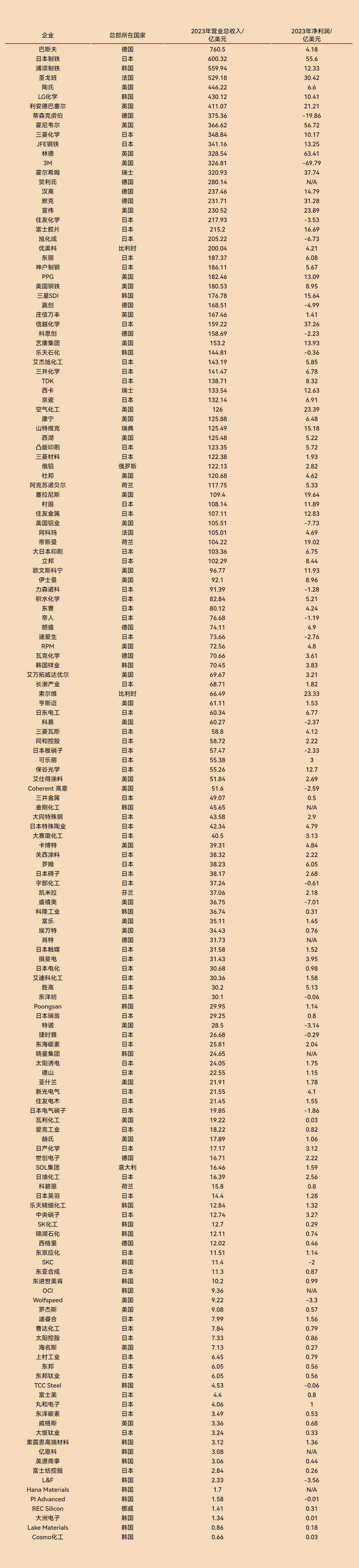 关键词:3M、TDK、阿科玛、阿克苏诺贝尔、埃万特、艾迪科化工、艾杰旭化工、艾仕得涂料、巴斯夫、保谷光学、村田、大日本印刷、大赛璐化工、德山、迪睿合、帝斯曼、蒂森克虏伯、东邦、东曹、东京应化、东丽、东洋纺、杜邦、俄铝、富乐、富士胶片、汉高、赫氏、亨斯迈、霍尼韦尔、积水化学、京瓷、卡博特、科慕、科思创、可乐丽、空气化工、朗盛、立邦、利安德巴塞尔、罗杰斯、罗姆、美国钢铁、美国铝业、默克、欧文斯科宁、日本碍子、日本板硝子、日本电气硝子、日本制铁、日产化学、日东电工、塞拉尼斯、三井化学、三井金属、三菱材料、三菱化学、三菱瓦斯、山特维克、圣戈班、胜高、世创电子、索尔维、太阳诱电、凸版印刷、瓦克化学、西格里、西卡、信越化学、旭化成、宣伟、亚什兰、赢创、长濑产业、中央硝子、住友化学、住友金属、Coherent 高意、Cosmo化工、Hana Materials、JFE钢铁、L&F、Lake Materials、LG化学、OCI、PI Advanced、Poongsan、PPG、REC Silicon、RPM、sama 三亚铝业、SKC、SK化工、SOL集团、Syensqo、TCC Steel、Wolfspeed、艾万拓威达优尔、爱克工业、曹达化工、大坂钛业、大同特殊钢、大洲电子、迪爱生、帝人、东邦钛业、东海碳素、东进化学、东进世美肯、东亚合成、东洋碳素、富士纺控股、富士美、关西涂料、海明斯、韩国锌业、韩松化学、贺利氏、霍尔希姆、捷时雅、金刚化工、锦湖石化、凯米拉、康宁、科碧恩、科隆工业、乐天精细化工、乐天石化、力森诺科、林德、美源商事、浦项制铁、日本触媒、日本电化、日本瑞翁、日本特殊陶业、日本吴羽、日油化工、三星SDI、上村工业、神户制钢、盛禧奥、索路思高端材料、太阳控股、陶氏、特诺、同和控股、瓦利化工、丸和电子、威格斯、西湖、晓星集团、肖特、新光电气、伊士曼、揖斐电、亿恩科、艺康集团、优美科、宇部化工、昭和电工、住友电木、庄信万丰